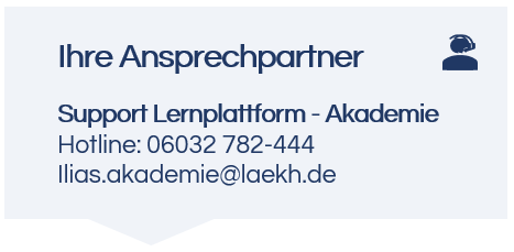 In einer „Blended-Learning-Veranstaltung“ absolvieren Sie neben den Präsenzphasen einen Teil Ihrer Fortbildung online in einer E-Learning-Phase. Die zugehörigen Lerninhalte werden im Selbststudium erarbeitet und ggfs. durch einen Tutor / eine Tutorin fachlich begleitet. Auch in anderen Veranstaltungsformaten kann die Lernplattform zum Einsatz kommen – so zum Beispiel zur Bereitstellung von Digitalen Handouts, Informationen und Arbeitsmaterialien oder auch zur Teilnahme an Tests oder Prüfungen.